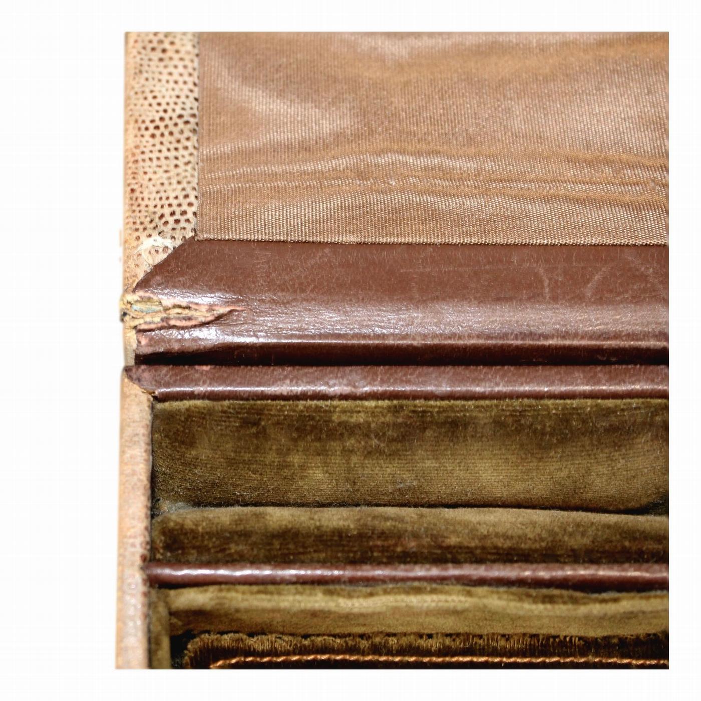 The compartments and ring storage have their original sage green velvet linings and the top two compartments have their original velvet pads. The inside of the lid has its original brown watered silk lining.
