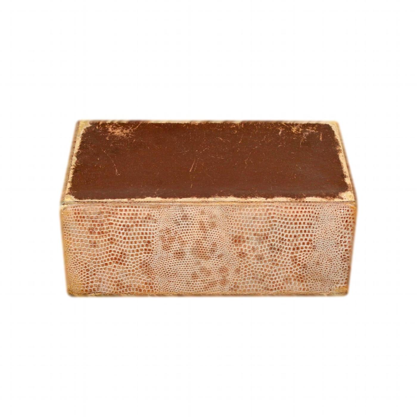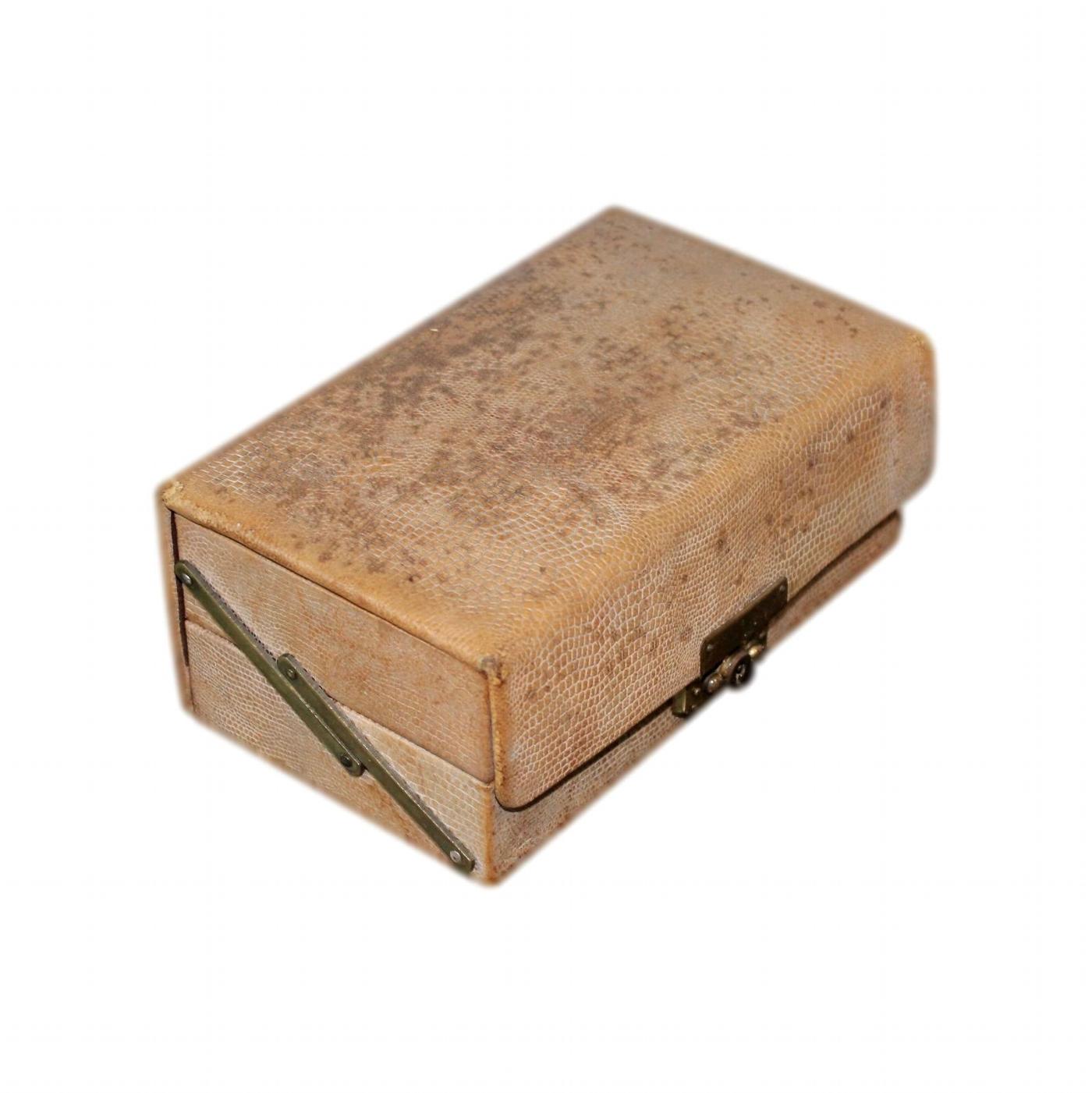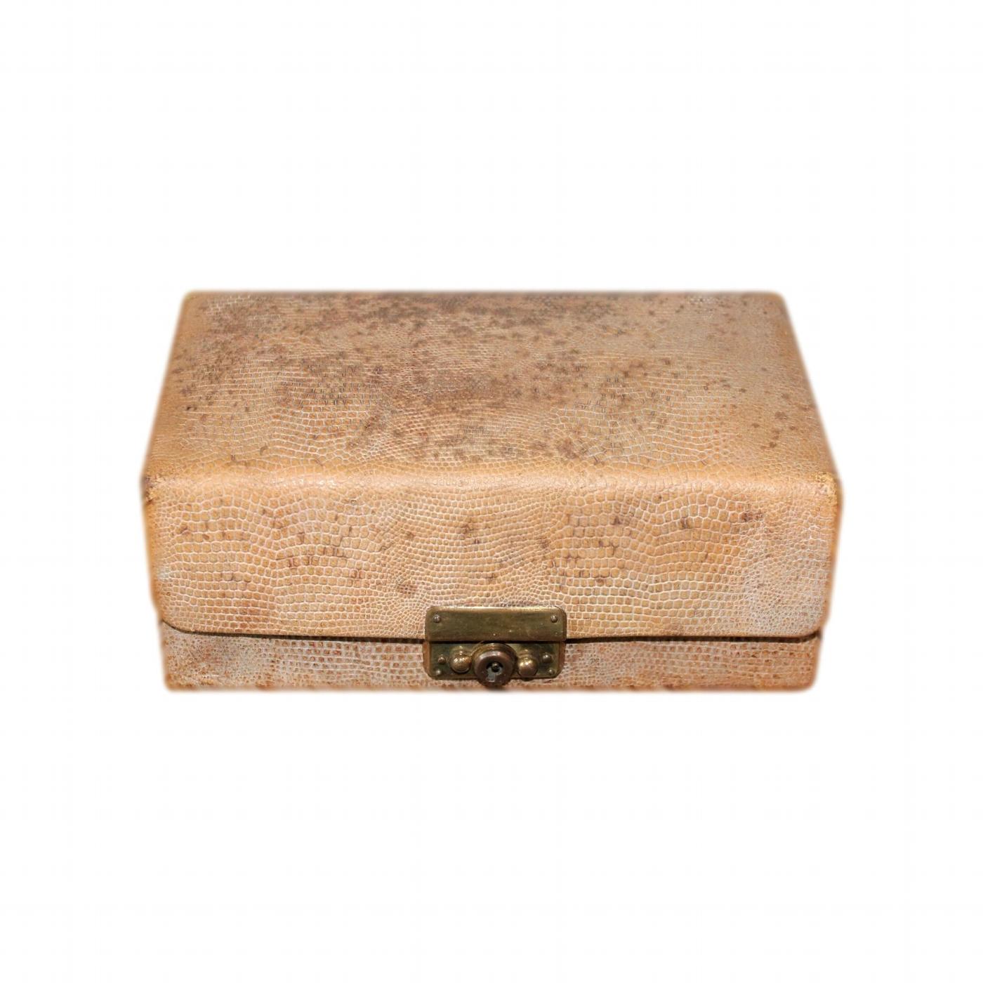 A small 1920s Art Deco jewellery box with a faux snakeskin finish and a secure polished gold metal catch.