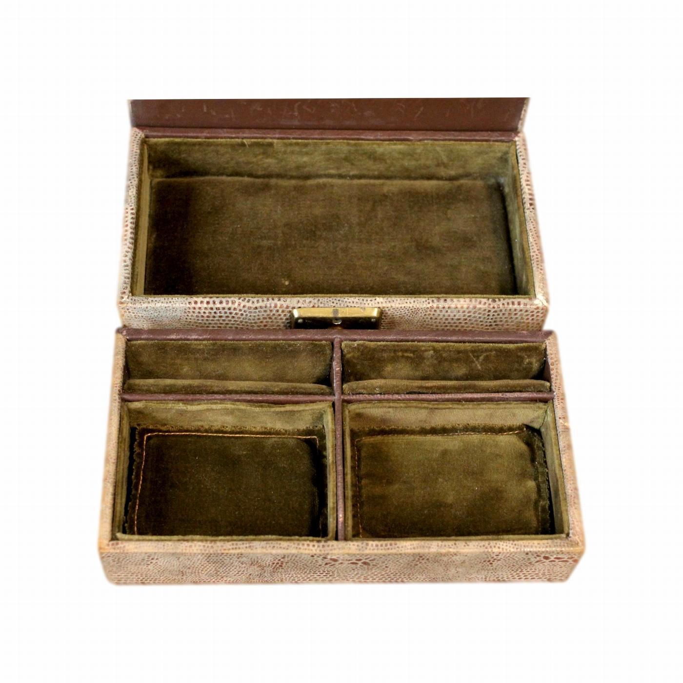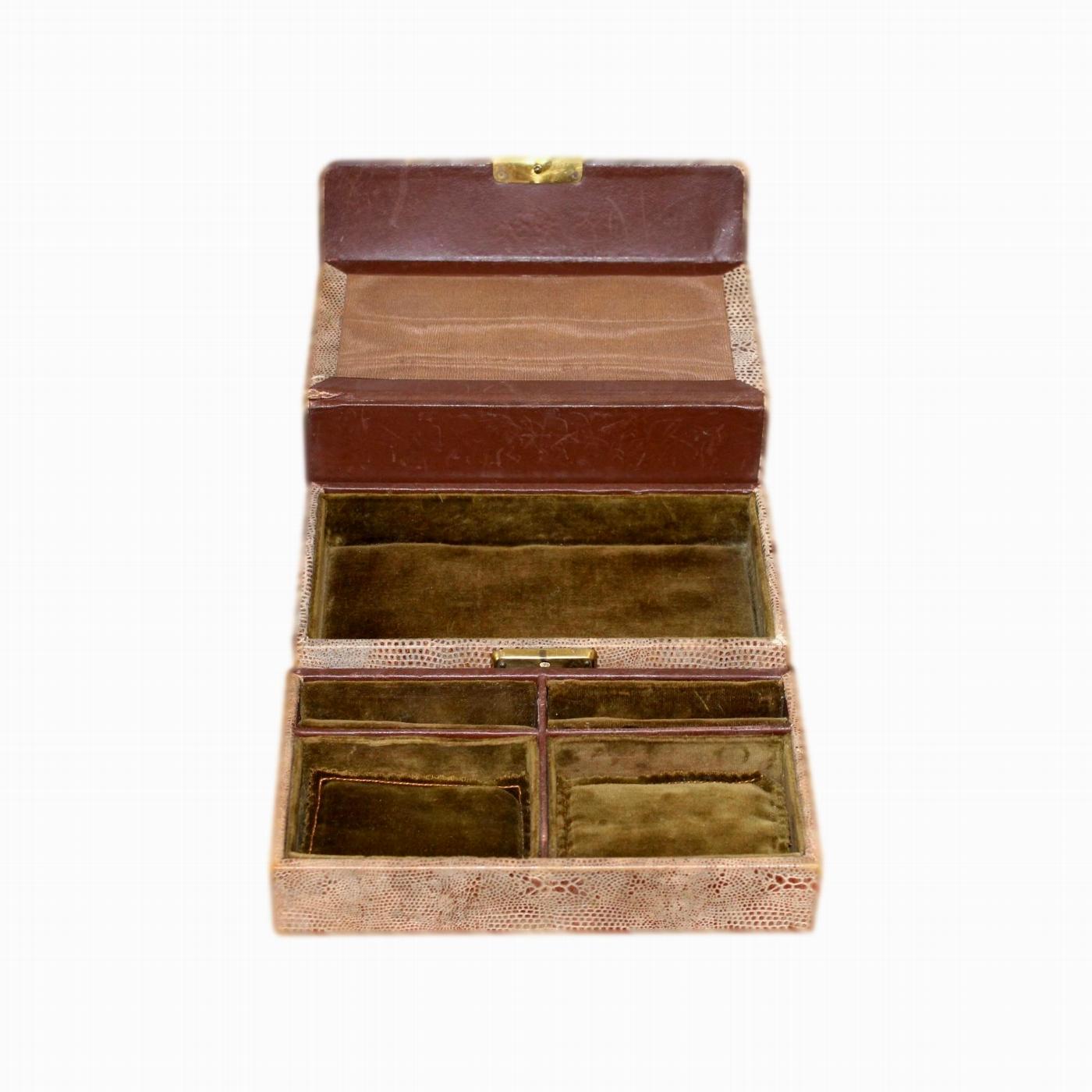 This is a nicely lined small Art Deco jewellery box with a faux snakeskin finish. It dates to the 1920s and has multiple compartments.