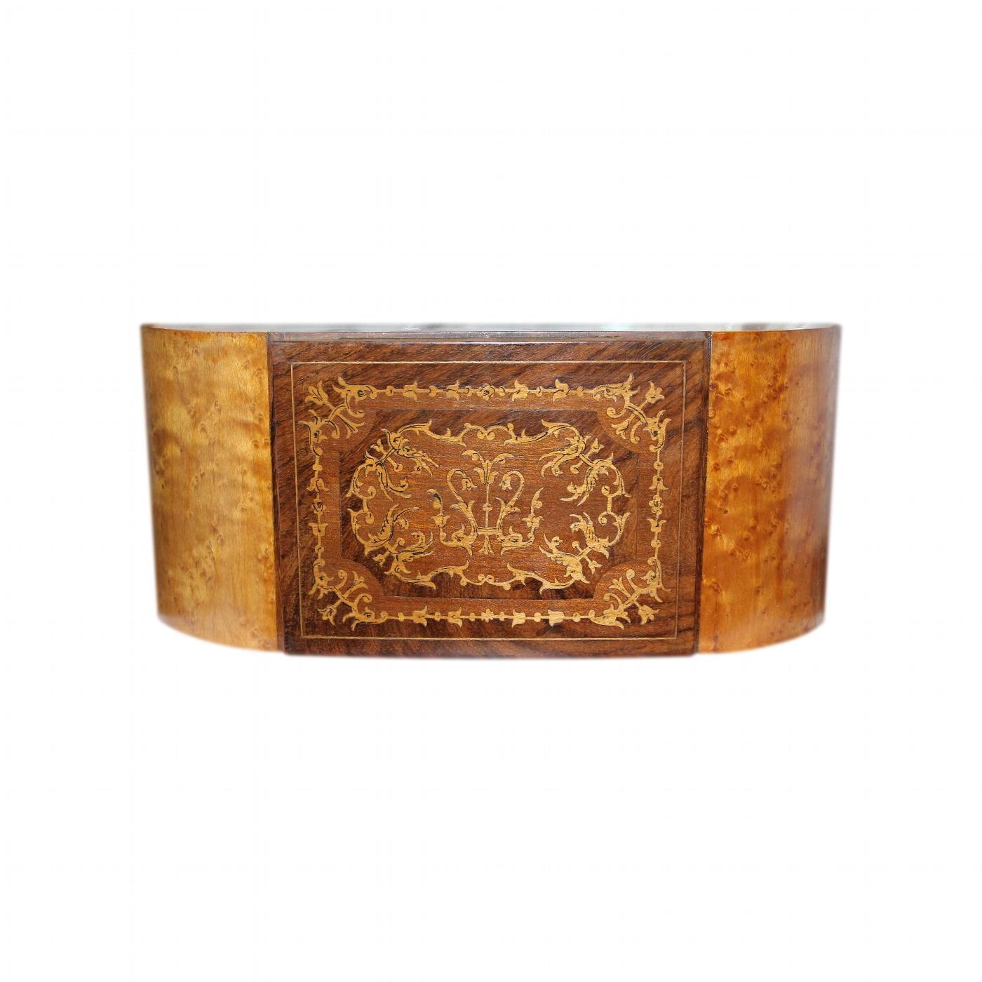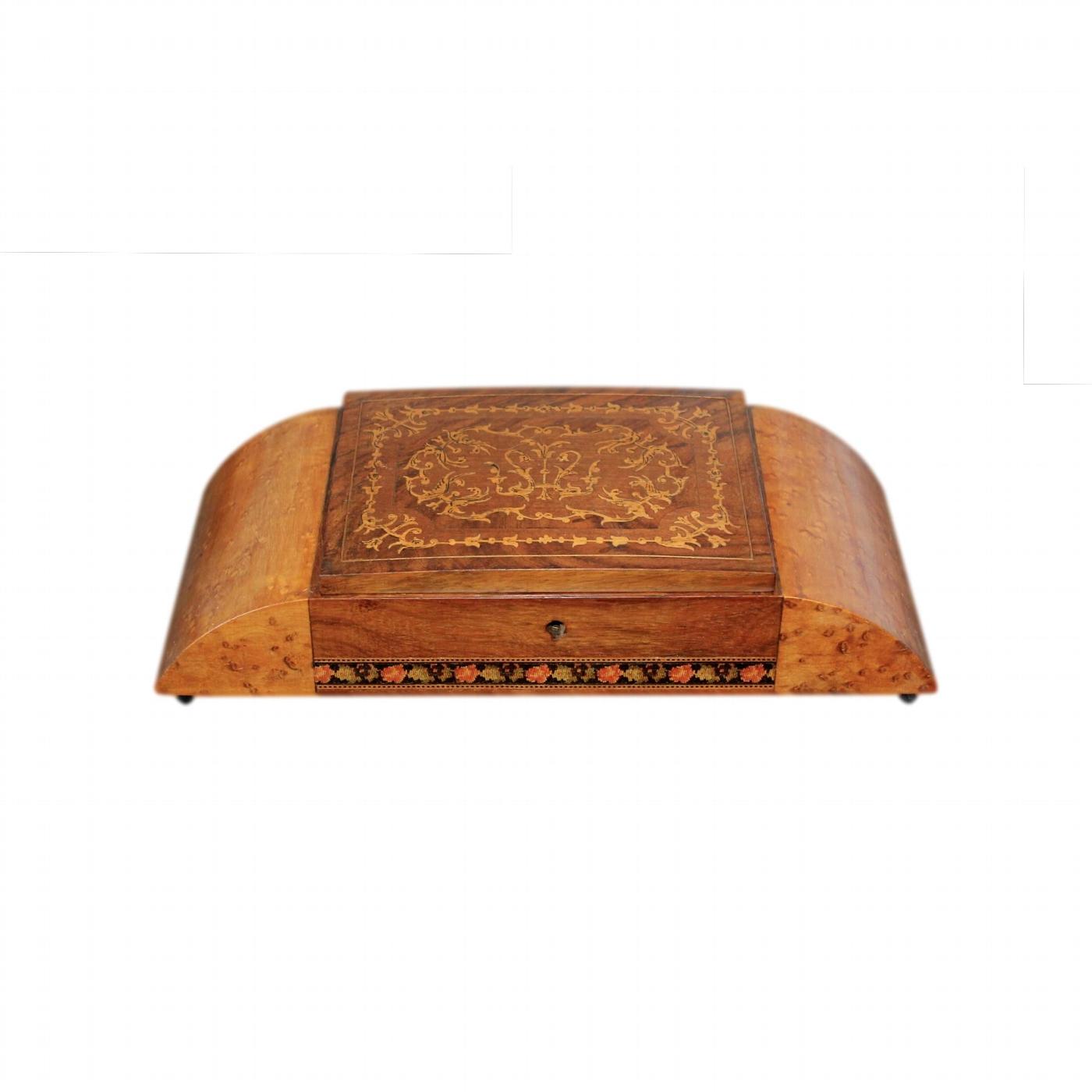 The lid has a beautiful marquetry inlay, featuring decorative foliage/vines.