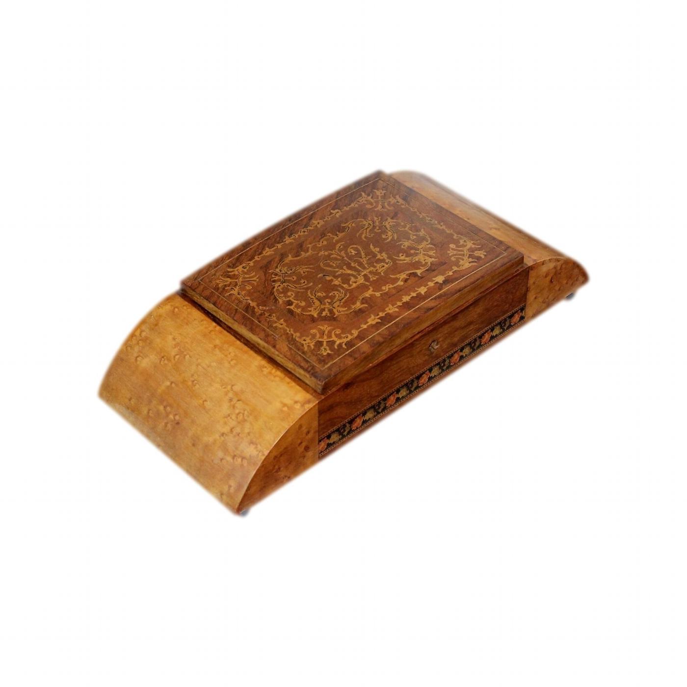 The micro mosaic inlay on this box is known as 'mosaic tesselated inlay'. It is made up of hundreds of tiny pieces of wood, painstakingly put together to form intricate mosaic designs.