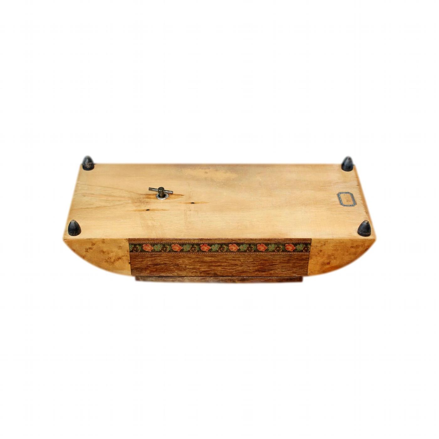 The movement is operated via the winding key on the bottom of the box. Three turns of the key are sufficient to wind up the musical movement. The movement is in good working order. The music stops as it should, when the lid is closed or when the movement has fully unwound.