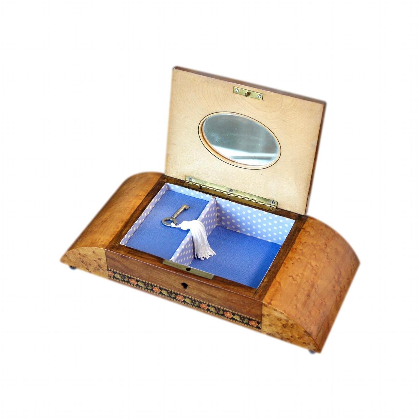 A beautiful 1950s vintage musical jewellery box from Sorrento in Italy. Beautiful marquetry and micro mosaic inlay. The interior has been fully refurbished with blue satin panels and quality paper linings.