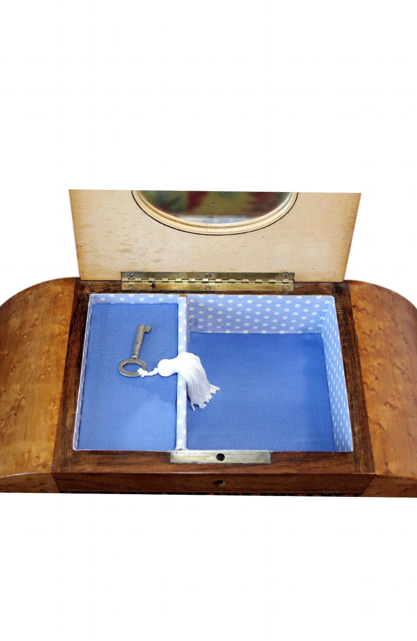 The interior has been fully refurbished with blue satin panels and quality paper linings with a polka dot print. The lid has its original fitted mirror.