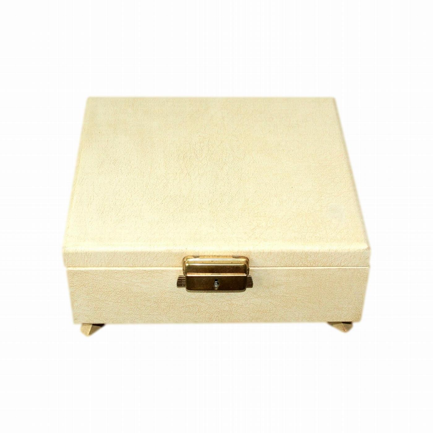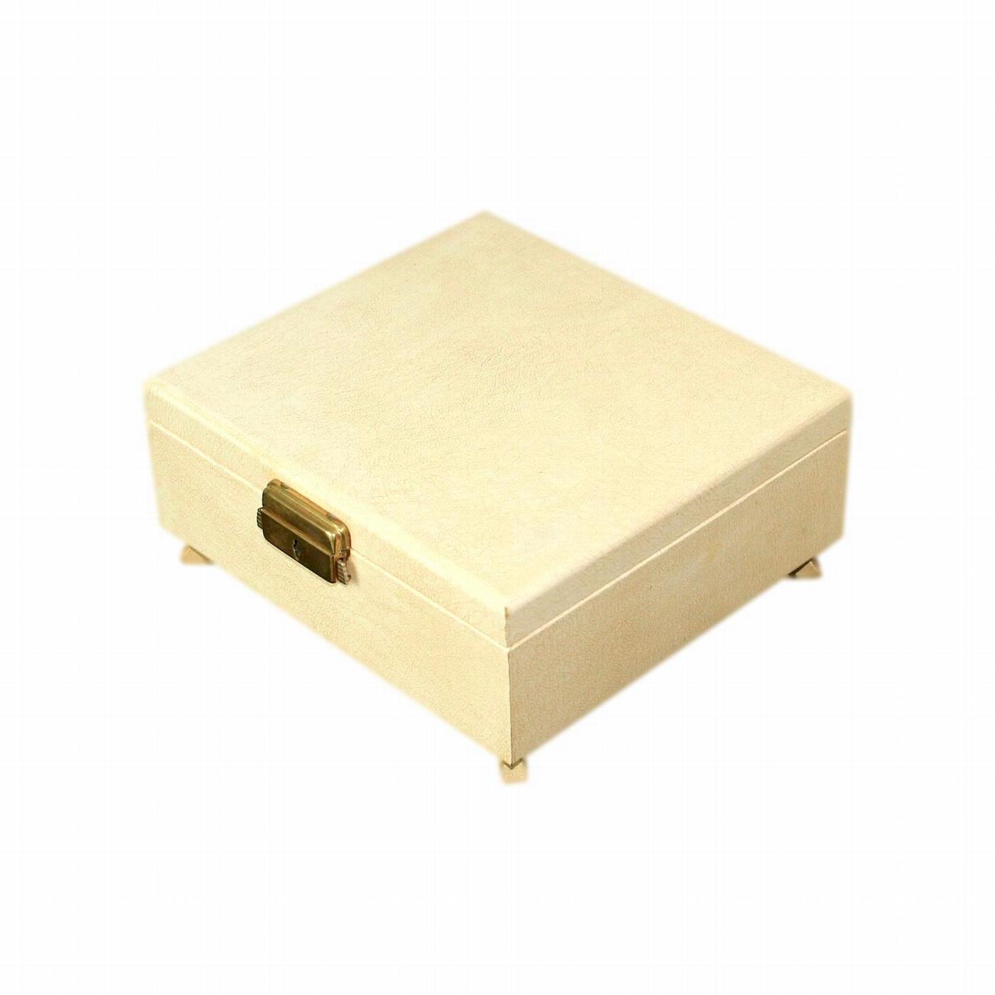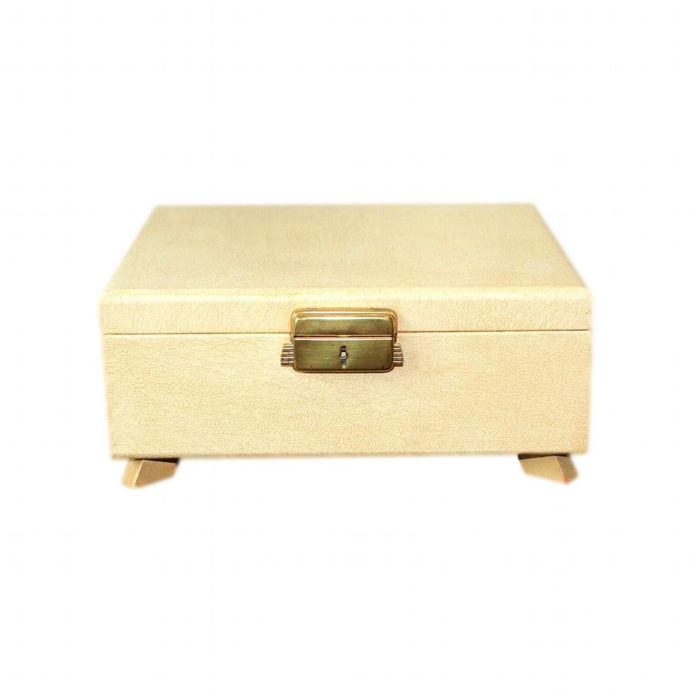 The box has a cream textured faux leather finish and its original gold metal clasp. It stands raised on its original stylish angular feet and has its original gold metal piano hinge.