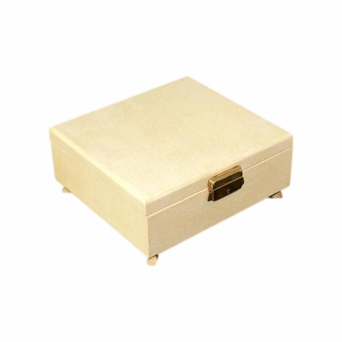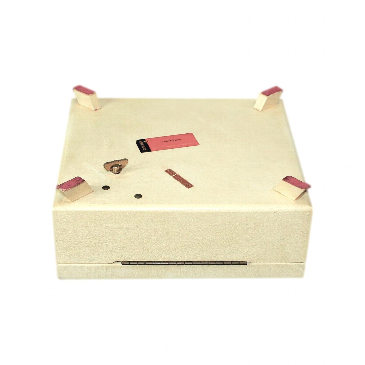 A vintage 1960s musical jewellery box with a cream faux leather finish. Partially refurbished interior. Plays 'I Love Paris'.