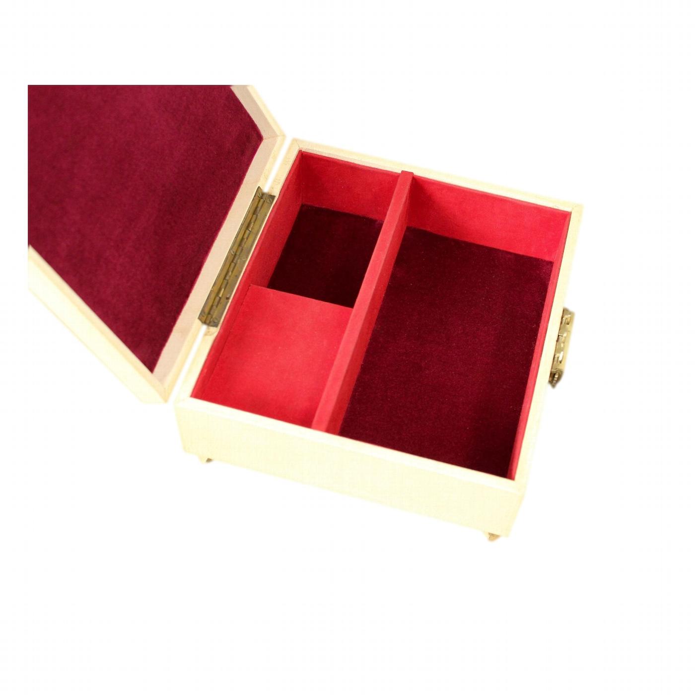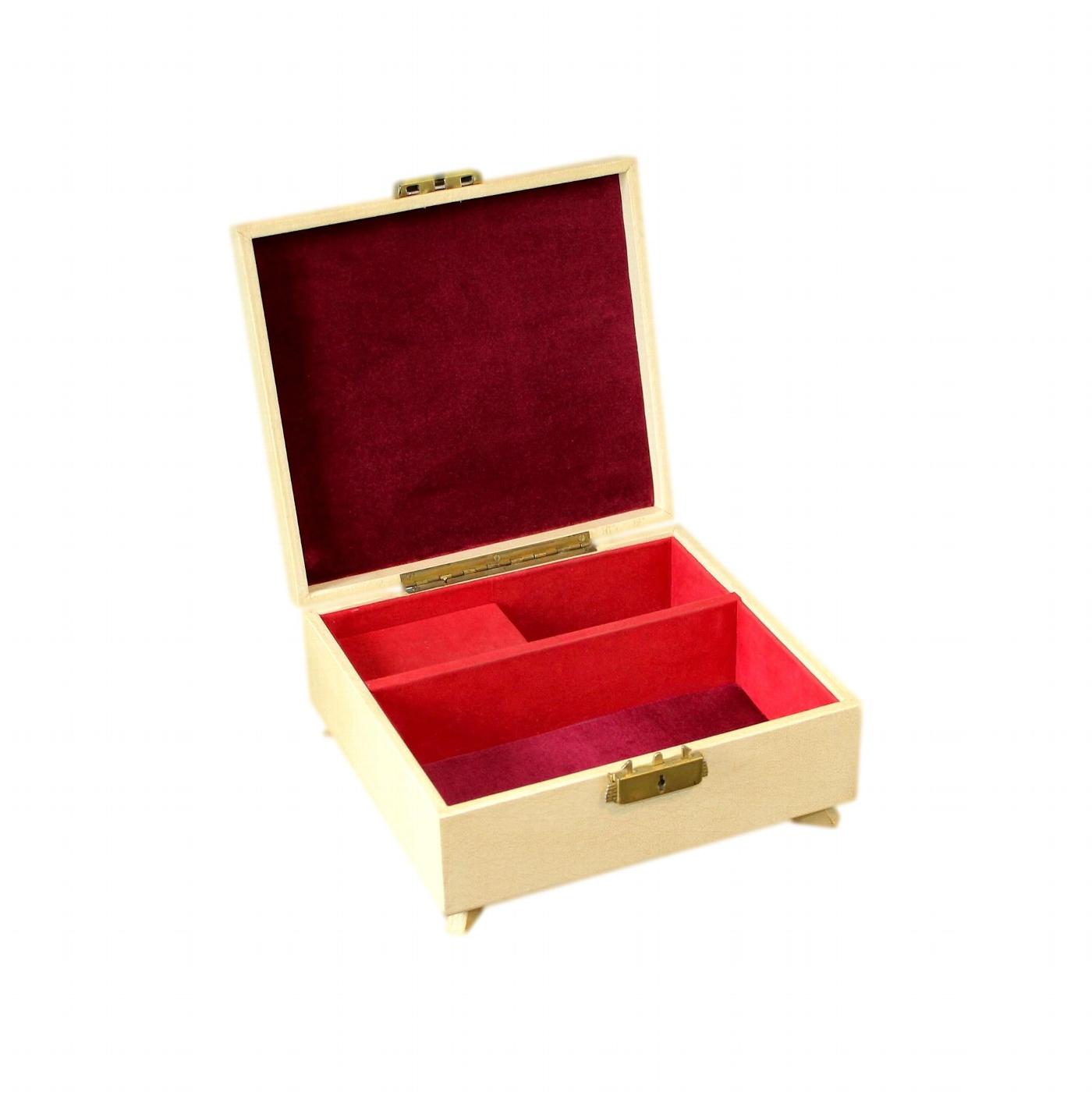 The interior has two storage compartments. The one at the front is fairly large and is deep enough to hold broad bangles and watches. The smaller rear compartment is the ideal size for storing little pieces of jewellery such as rings and earrings. The musical movement is cased to the left of this.