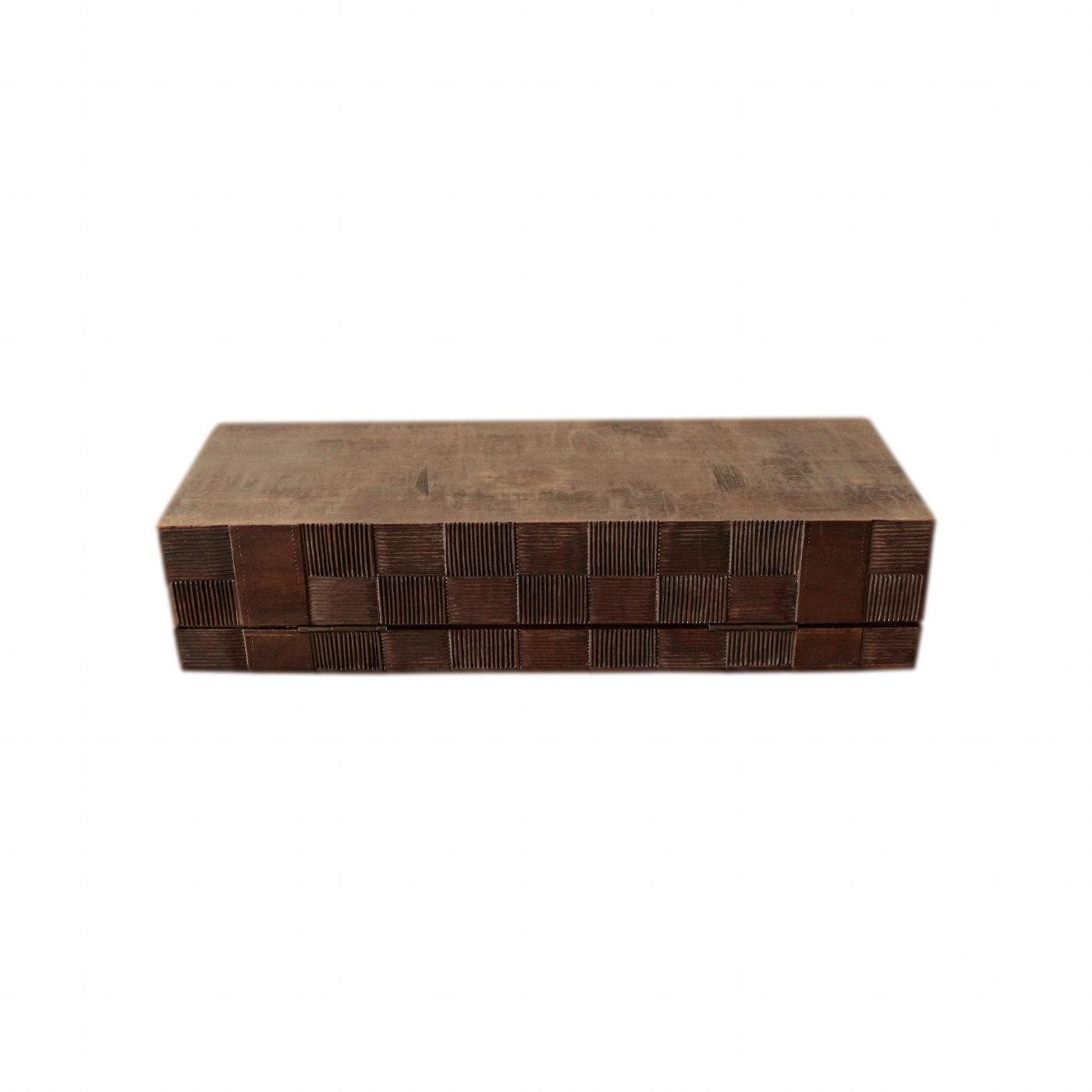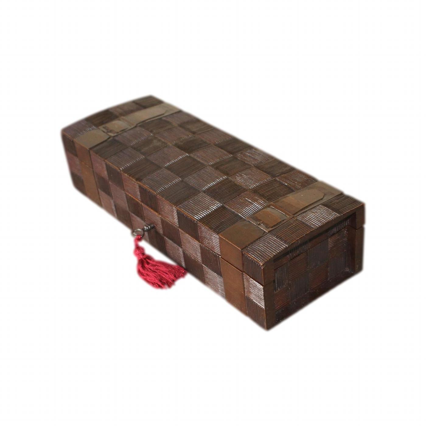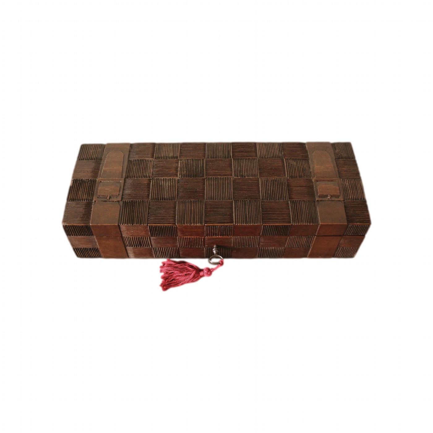 This beautiful Black Forest box does not have the more usual style of carved flowers or animals, rather it has a very decorative geometric chequerboard design with two carved 'straps' and 'buckles', giving the box a chest like appearance. The chequered feature has carved textured ridges and all of the wood has been richly coloured with a deep warm mahogany stain.