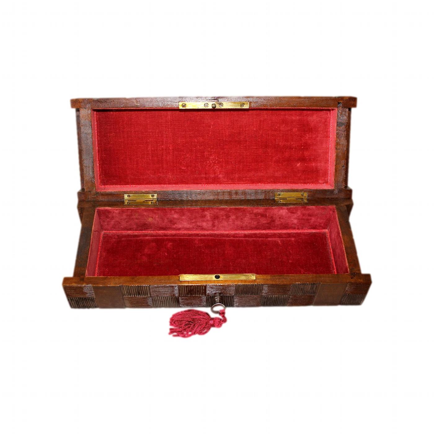 A beautiful antique jewellery box from the Black Forest region. Circa late 19th century. The interior has its original velvet linings and the exterior has a hand-carved chequerboard chest design. The box is complete with its original working lock and key.