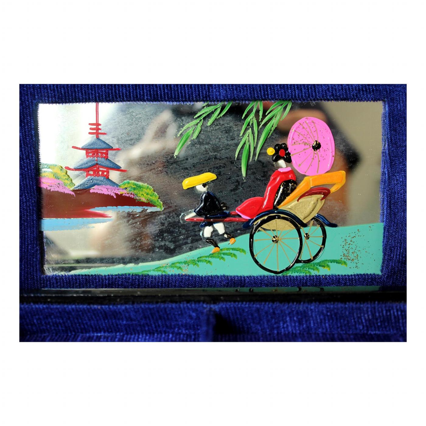 The inside of the lid has a fitted mirror with further hand-painted decoration. This features a Geisha girl with a parasol, being drawn on a rickshaw, as well as a temple and hills.