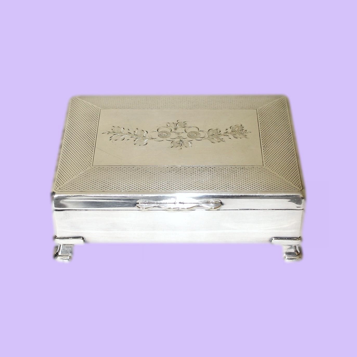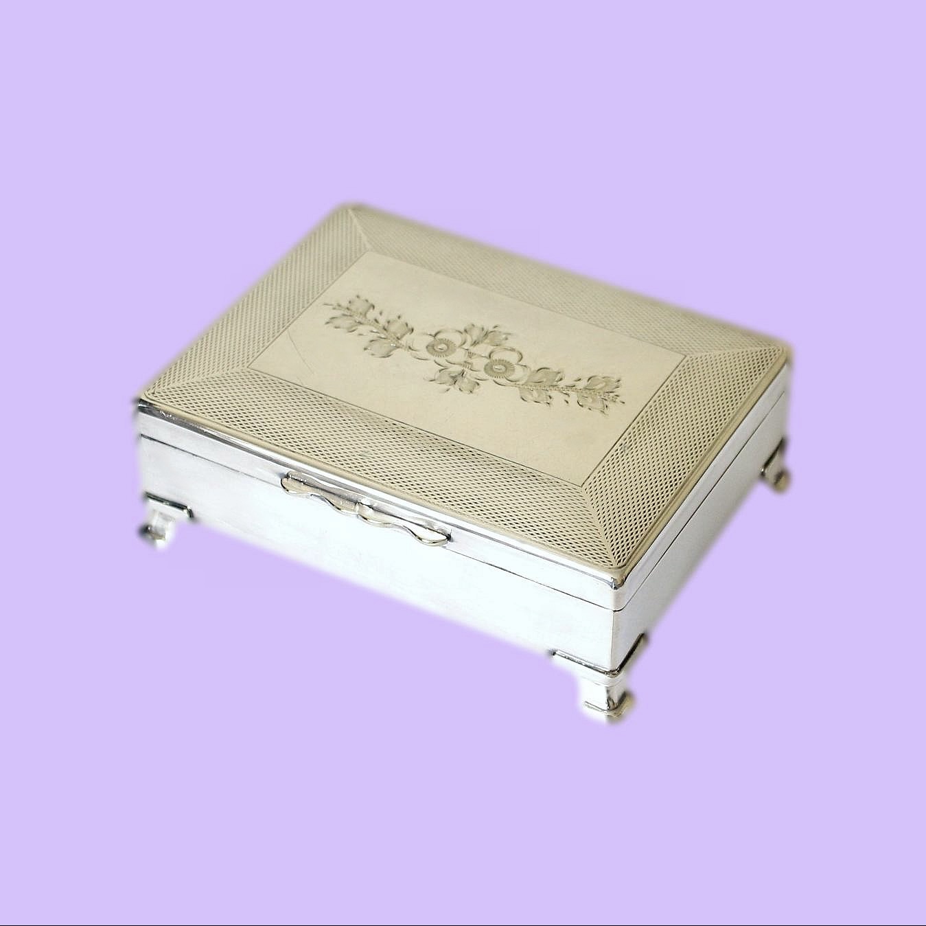 Beautiful Art Deco box, made of Electroplated Nickel Silver and having the appearance of solid silver. Very pretty engraved floral feature to the lid, surrounded by an engine turned engraved frame.