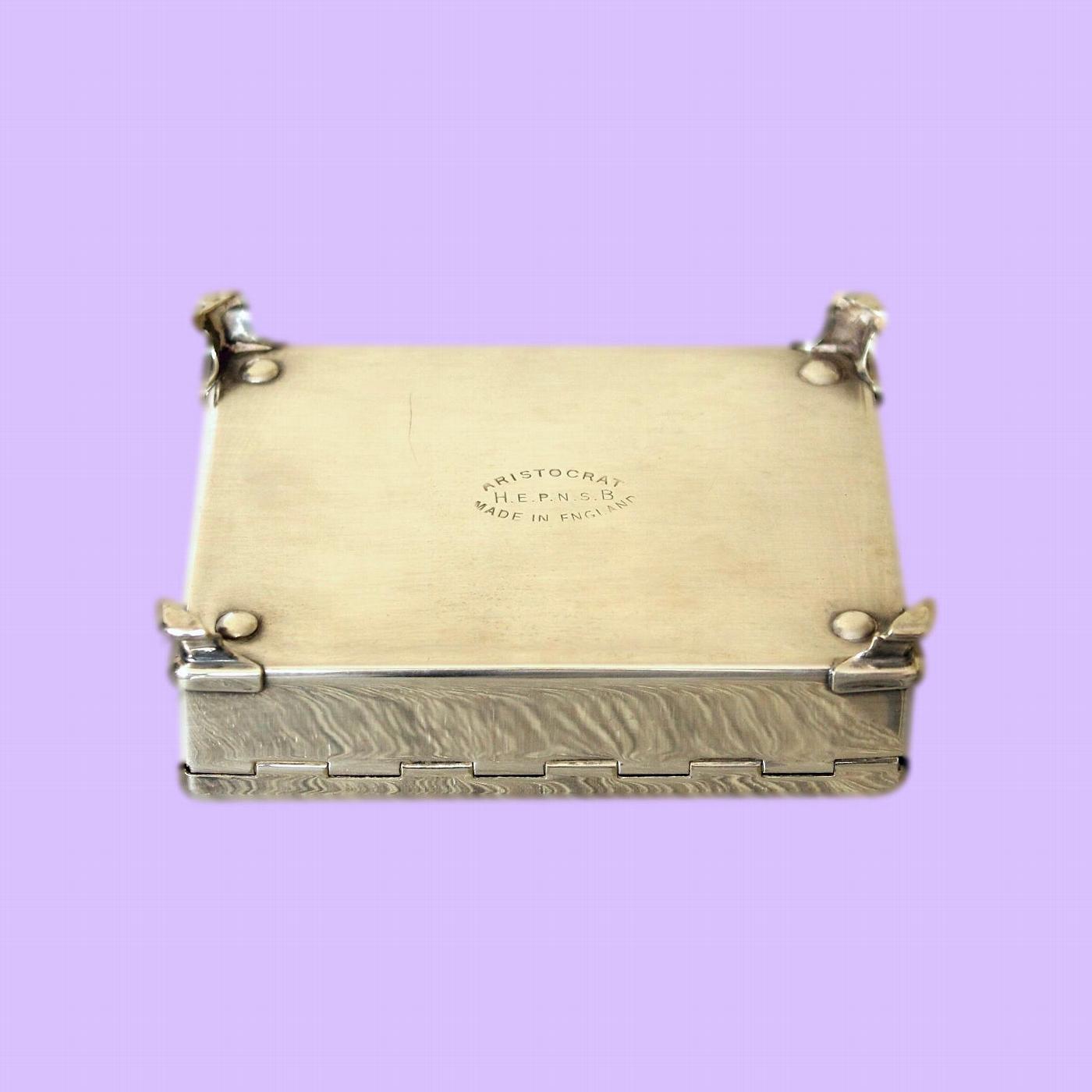 The bottom of the box is stamped ARISTOCRAT (the maker), H.E.P.N.S.B (with EPNS being the abbreviation for Electroplated Nickel Silver) and MADE IN ENGLAND.