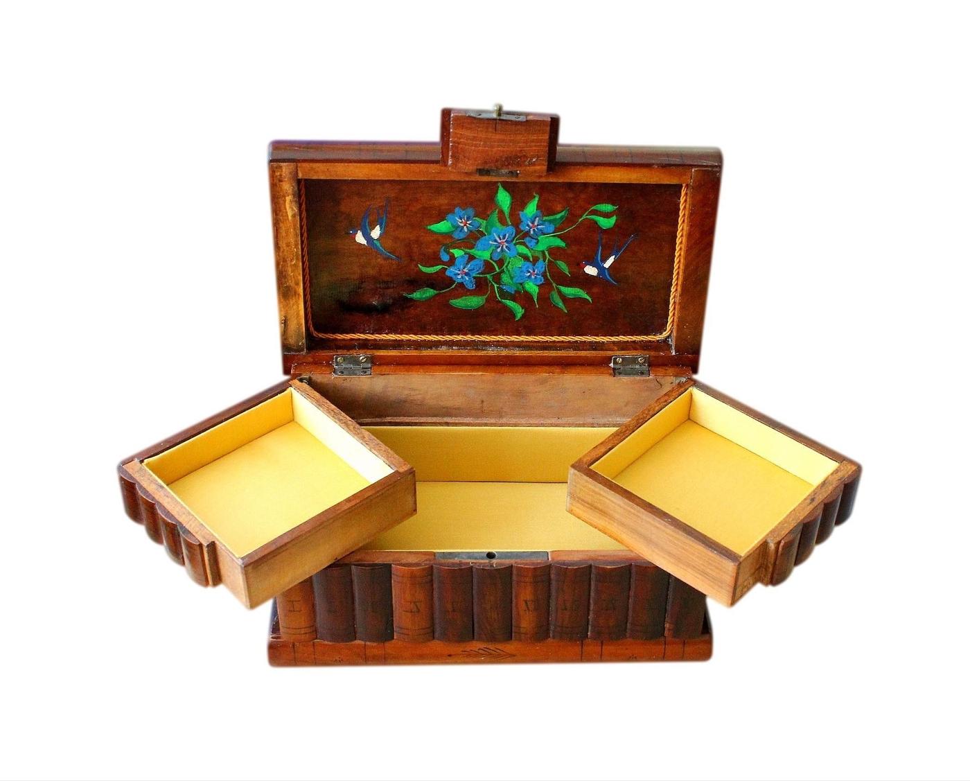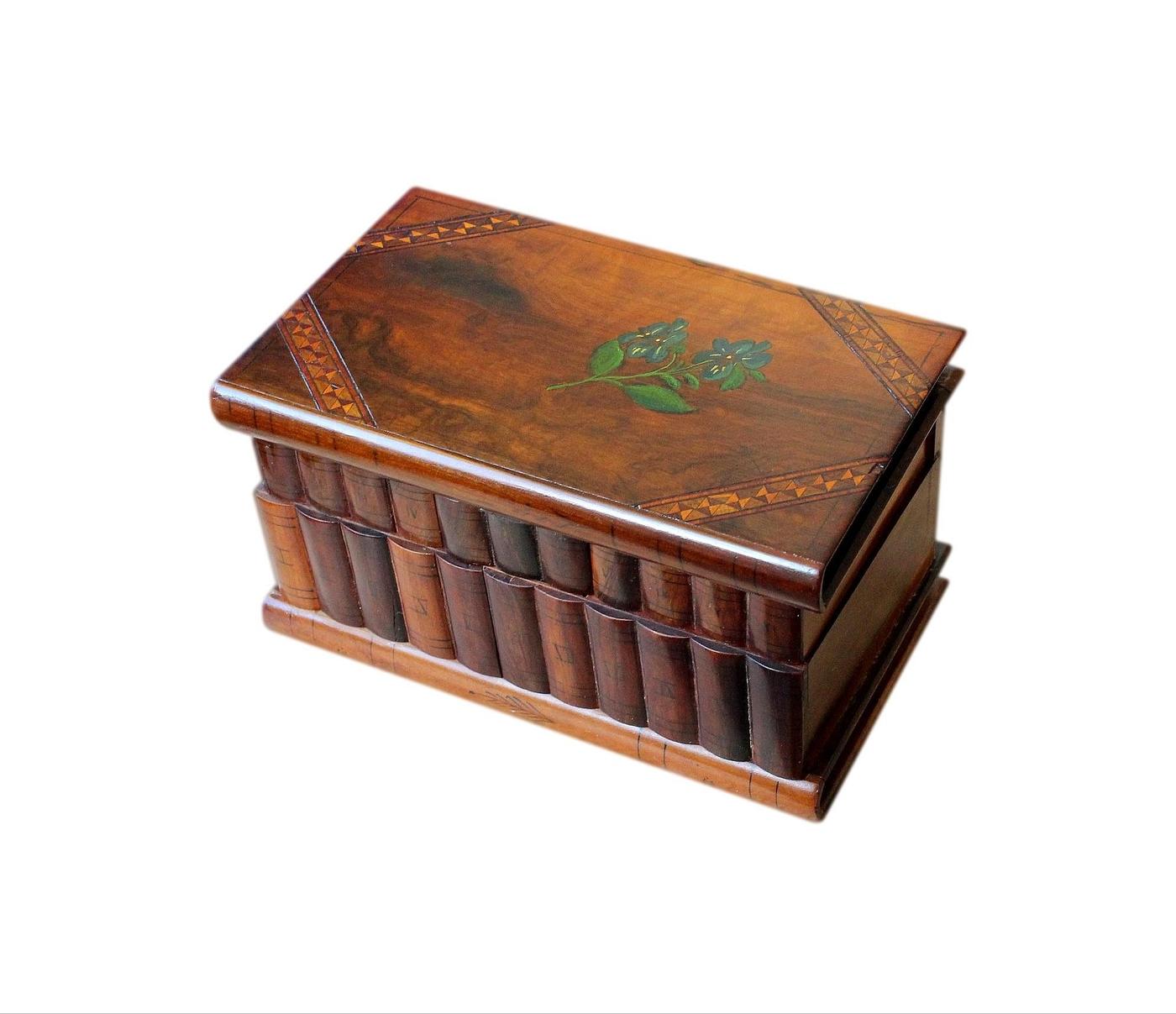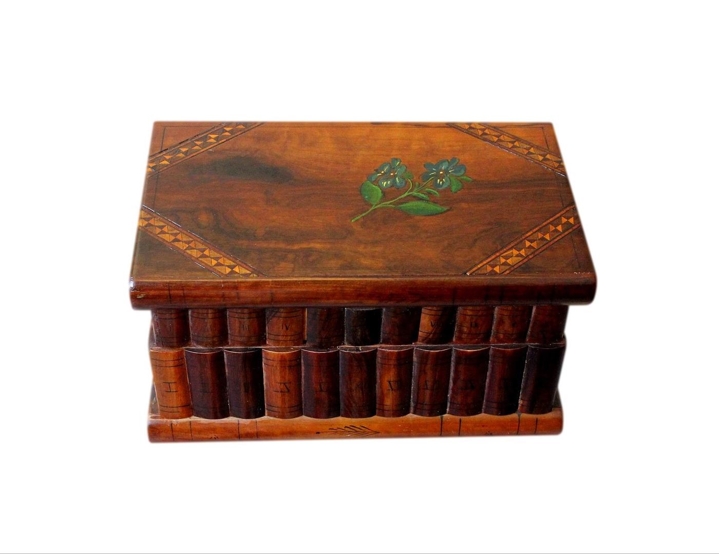 The box is in the form of books. There are two books horizontally placed at the top and bottom, and 2 rows of upright volumes in between. These are all numbered with hand-painted Roman Numerals (I to XI). There are also hand-painted details to the top and bottom books.