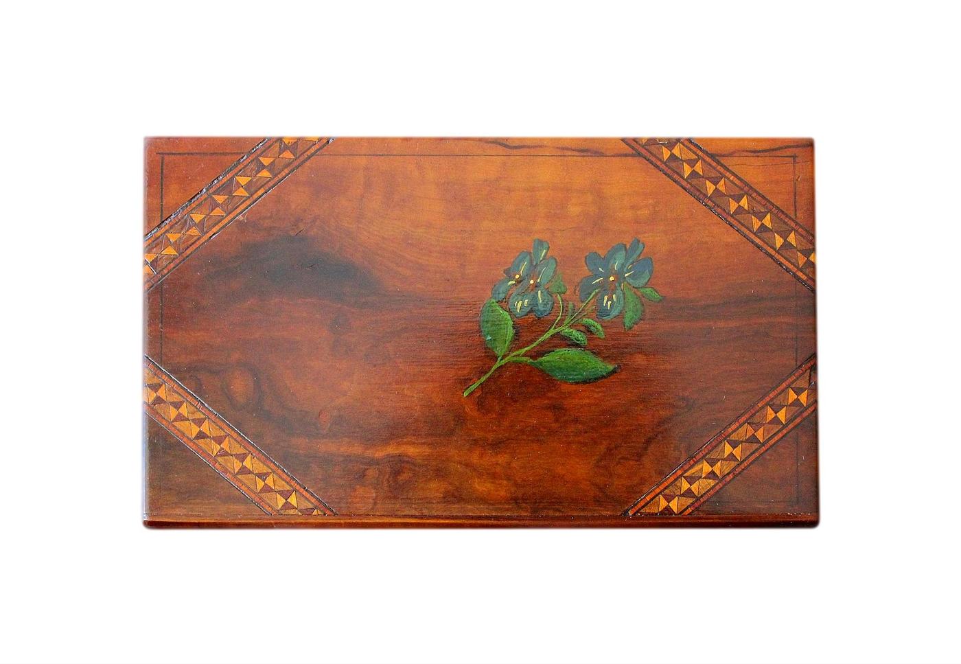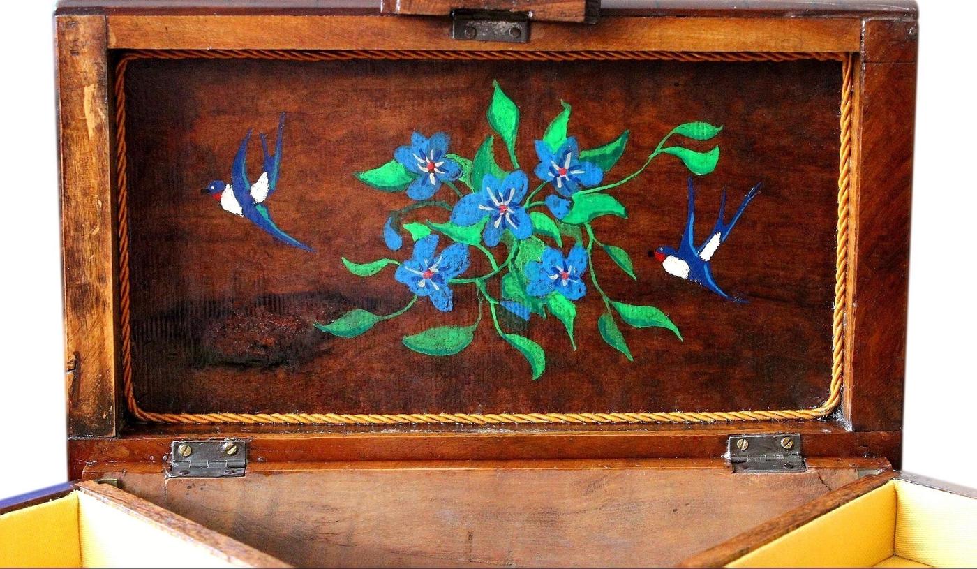 The lid has absolutely stunning decoration. It has two hand-painted flowers (professionally retouched by our restorer), and 4 beautiful inlaid micro mosaic strips, diagonally positioned across each corner. The micro mosaic inlay consists of hundreds of tiny pieces of wood, of numerous colourful varieties. The pieces have been skillfully positioned to create beautiful little squares. Each inlaid mosaic strip is identical and placed in a symmetrical fashion.