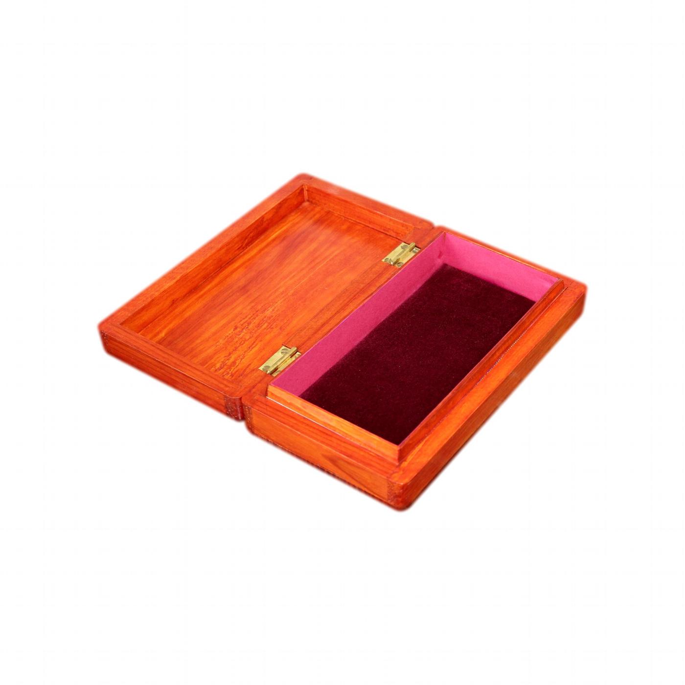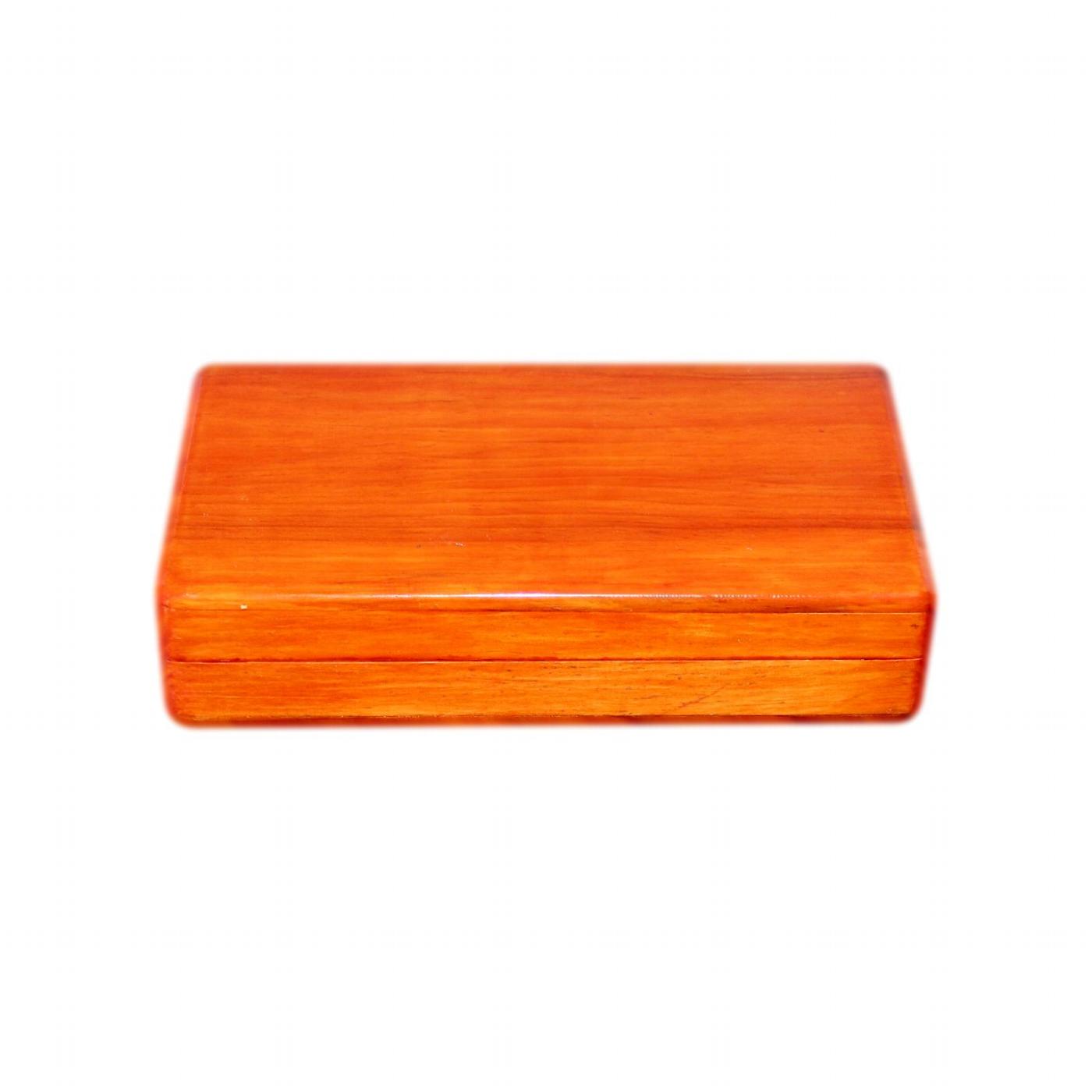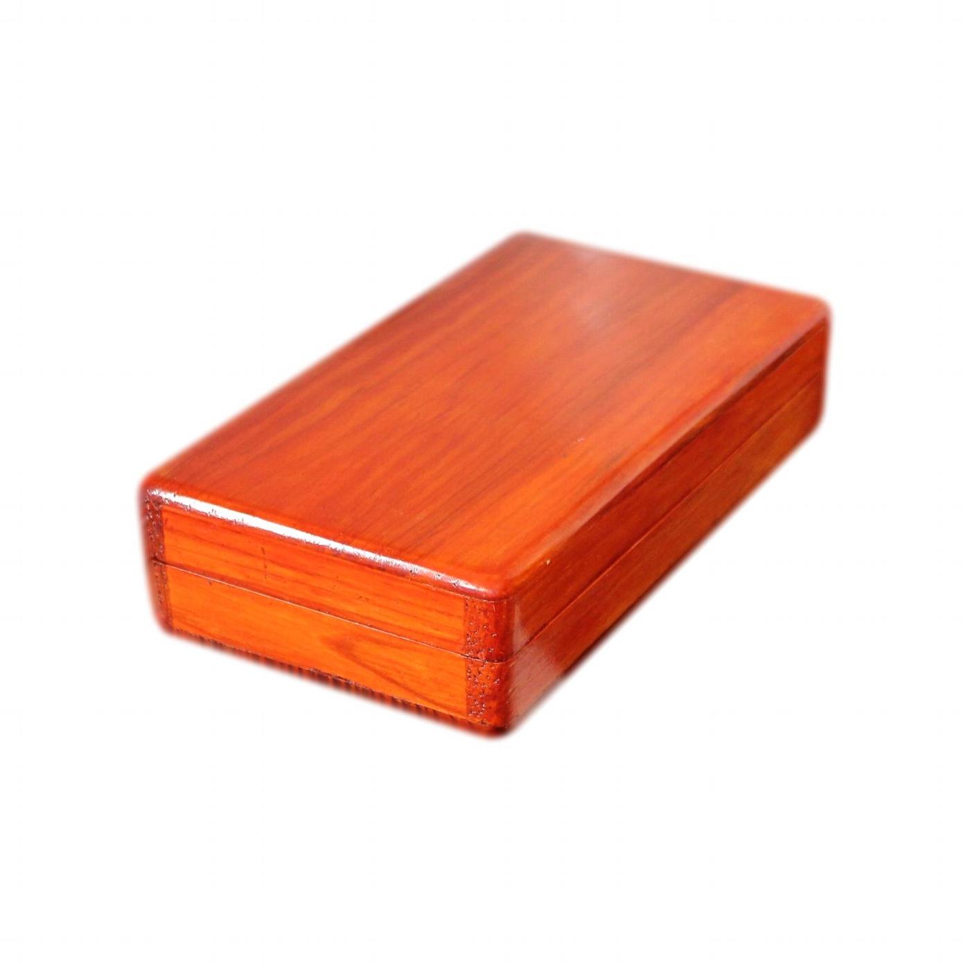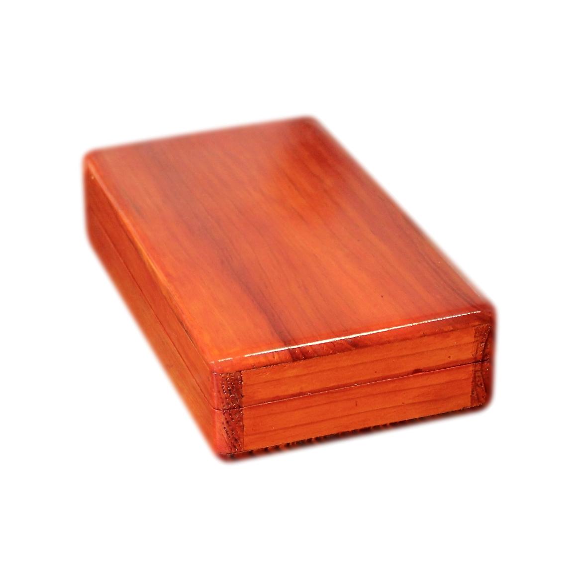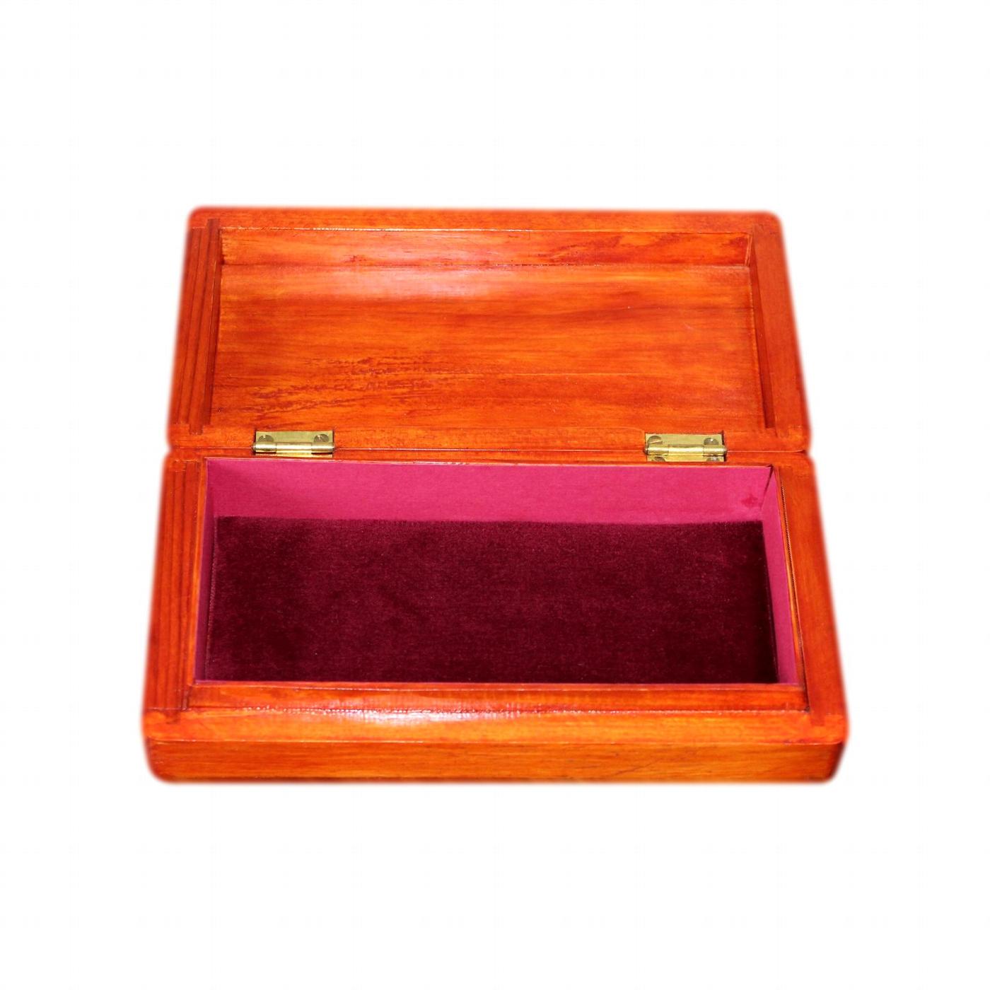 This box is made of solid wood. It has a rich cherry wood effect stain and a glossy varnished finish. The box has lovely rounded corners and quality dovetail joints. It is a somewhat rustic looking hand made box, not a mass produced machine made item.
