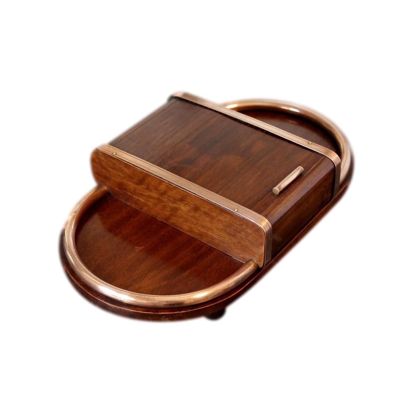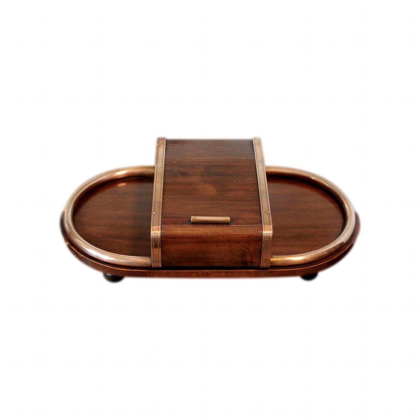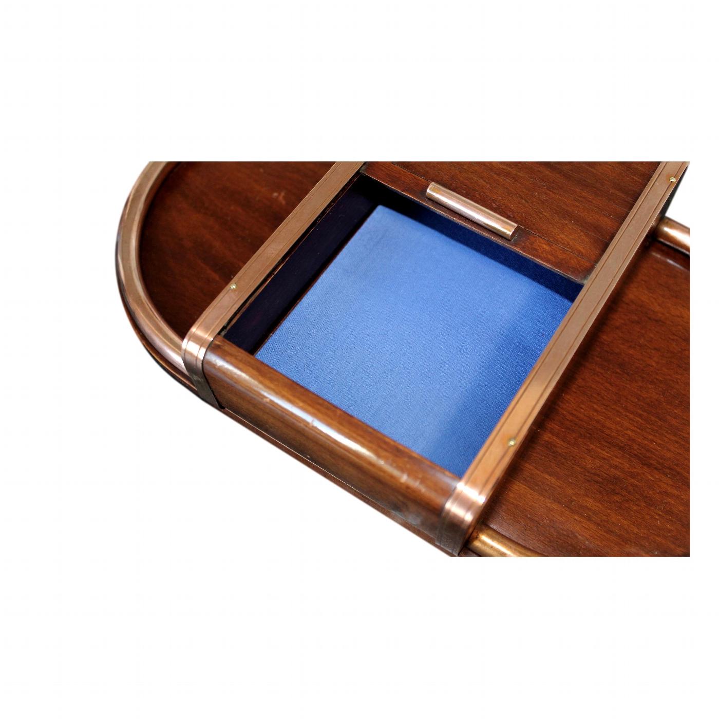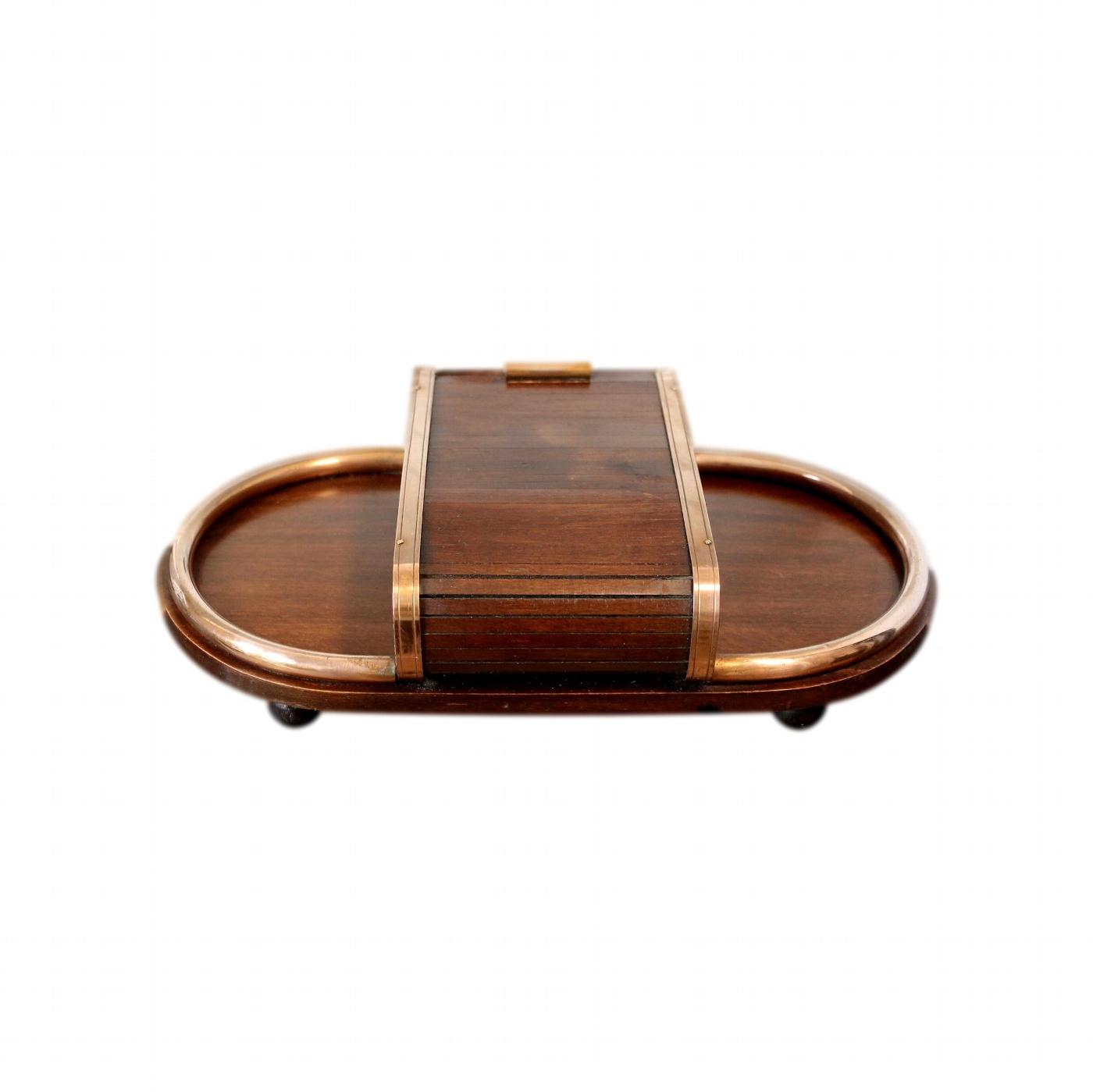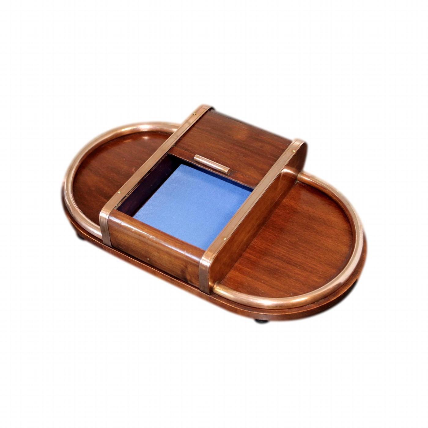 A very stylish and rare Art Deco box with trays. Made of Mahogany and decorated with beautiful copper tubing and banding. The interior has a new padded blue satin panel.