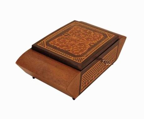The mosaic inlay is known as 'tesselated inlay'. This type of inlay is made up of 100s or 1000s of tiny pieces of wood, painstakingly put together to form intricate mosaic designs. The mosaic inlay on this box features chequered patterns, flowers and diamonds.