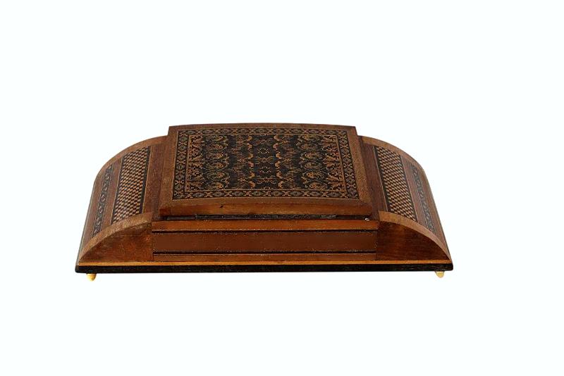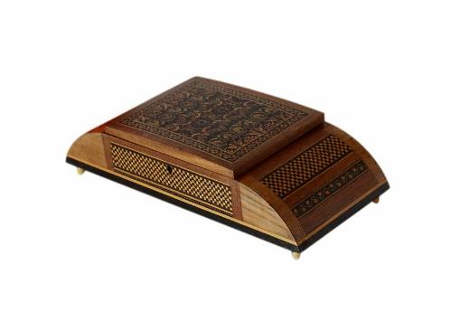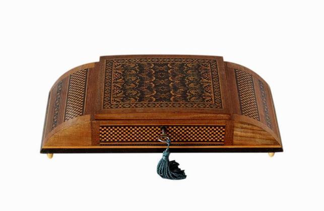 This box has an abundance of micro mosaic inlay, known as 'mosaic tesselated inlay'. This type of inlay is made up of 1000s of tiny pieces of wood, painstakingly put together to form intricate mosaic designs.
