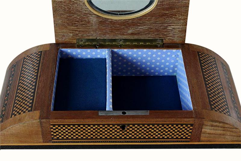 The inside of the lid has its original inset bevelled mirror. There is a lovely inlaid frame around the mirror.